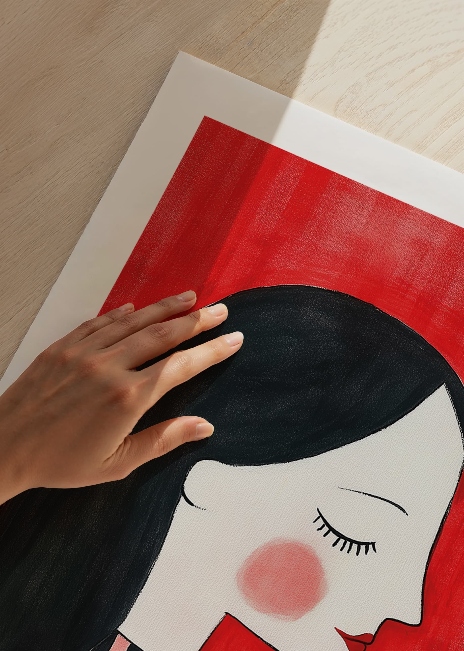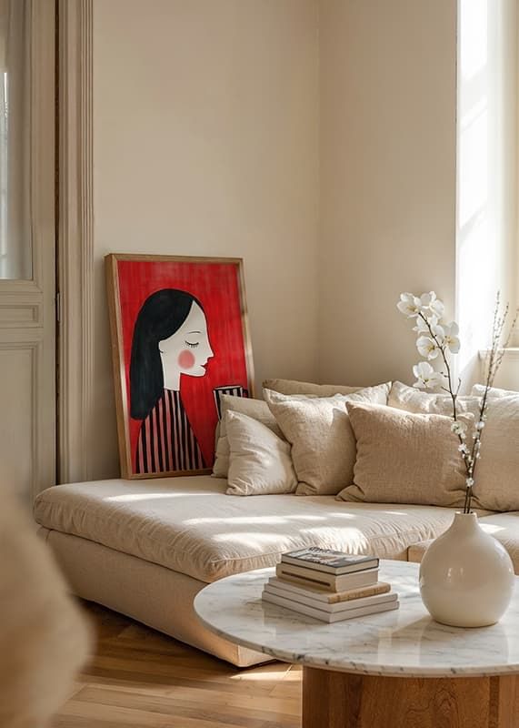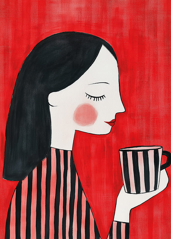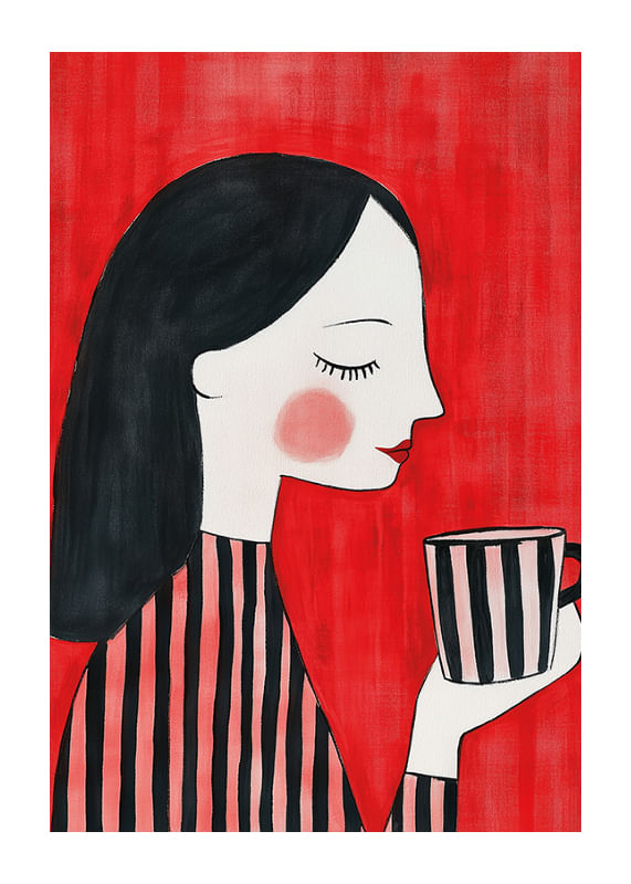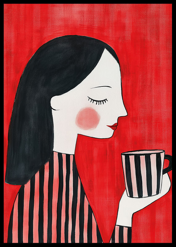 Discover a visual symphony of color and form with this poster, depicting an elegant woman in profile. With her black, flowing hair and striped clothing against the intense red of the background, she exudes calm and confidence as she enjoys a cup of tea.