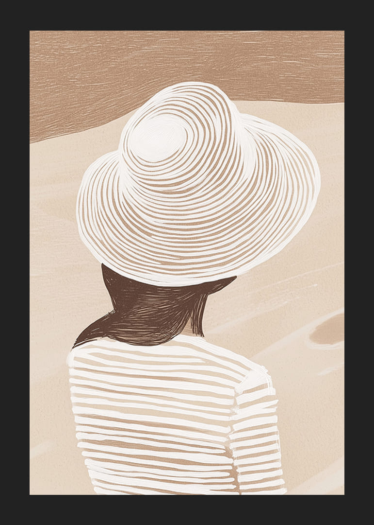 Dive into a world of elegance with this captivating poster, where soft, sandy tones create a sense of calm and relaxation. The stylish figure with a wide-brimmed hat symbolizes a meditative break from the hustle and bustle of everyday life.