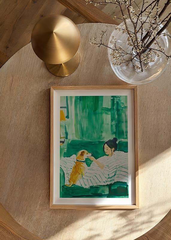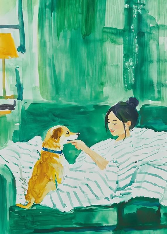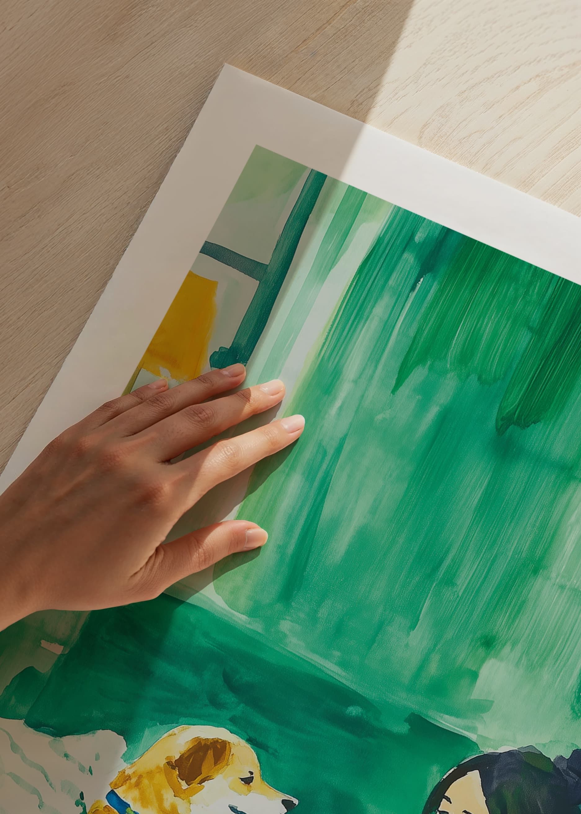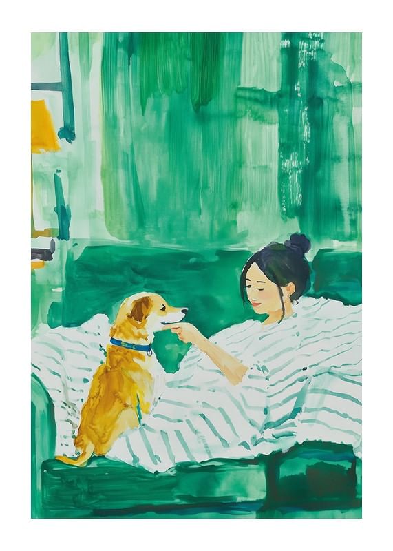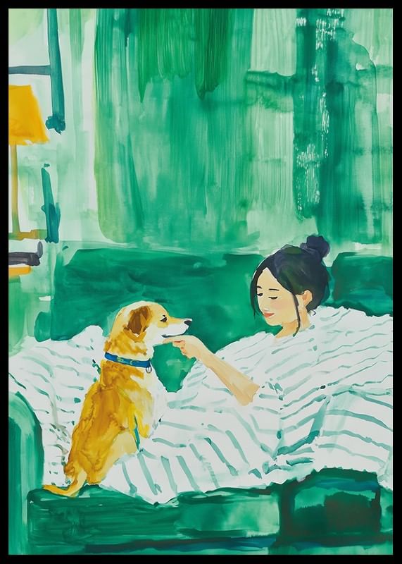 Experience the warm harmony of this beautiful poster, which embodies a quiet moment between a woman and her faithful dog. With a lush green background and soft brushstrokes, the image invites you to calm and closeness.