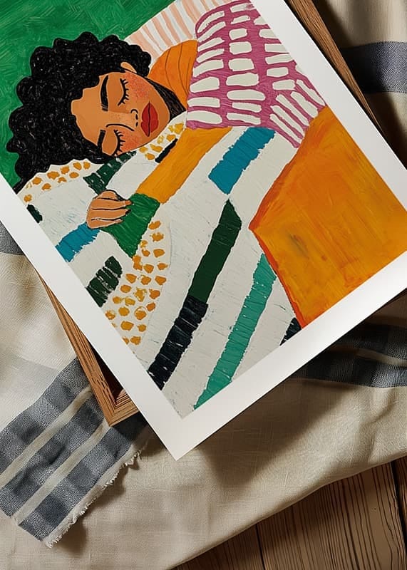 Experience peace and beauty with this colorful and expressive illustration of a sleeping person. The soft brushstrokes and harmonious colors create a feeling of warm care and tranquility, perfect for brightening up your bedroom or a cozy corner.