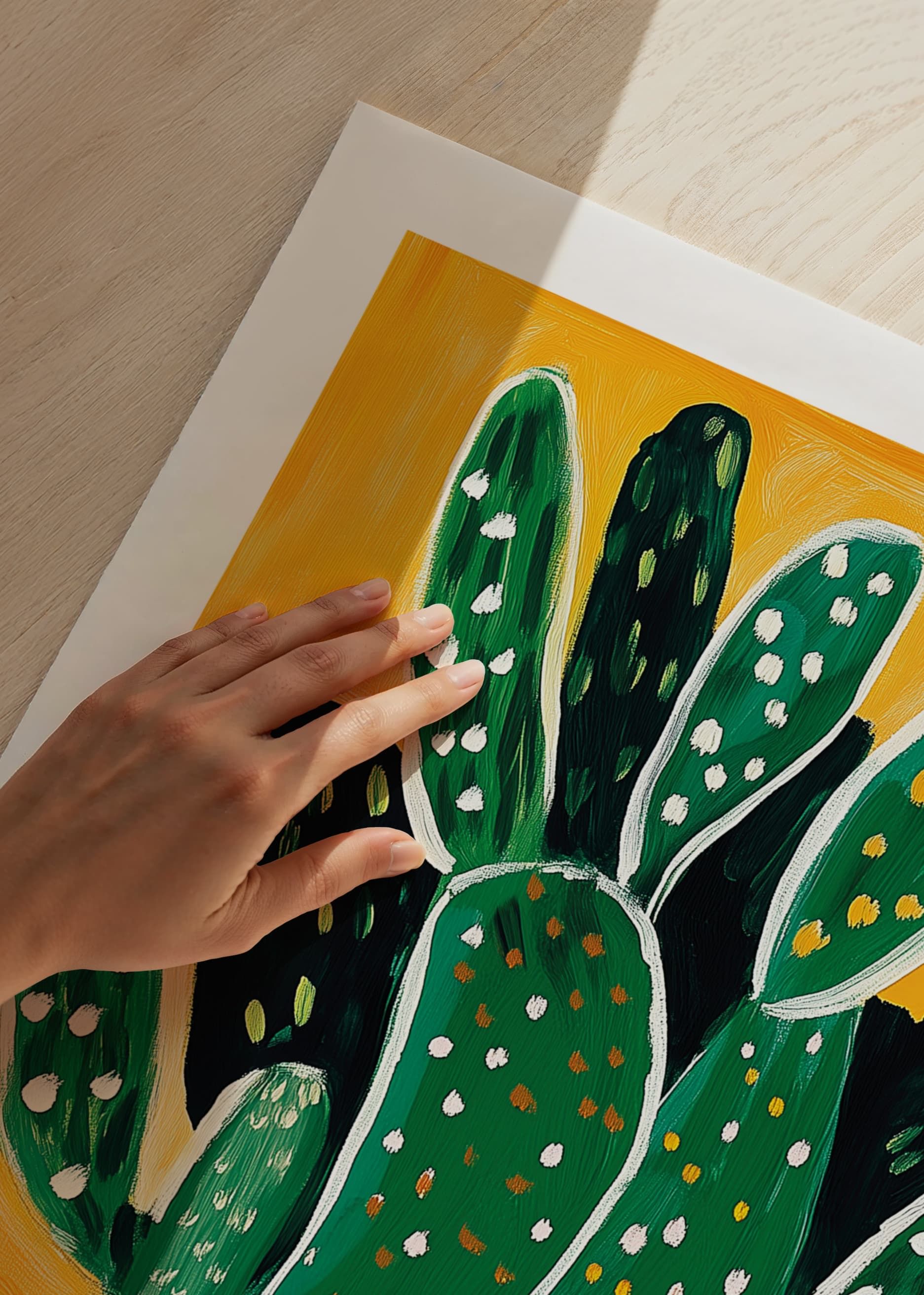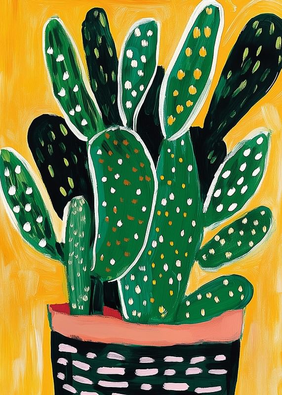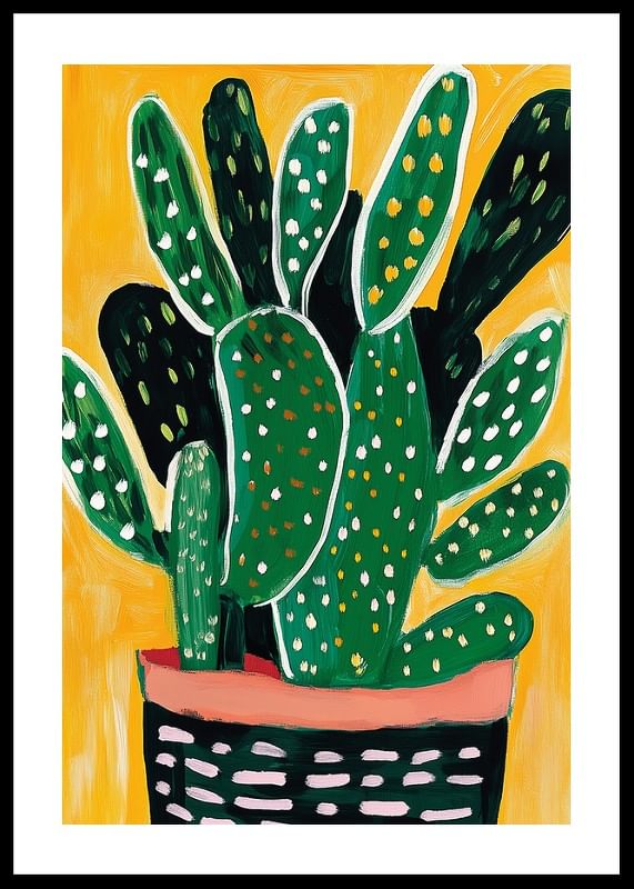 Brighten up your room with this vibrant cactus poster! The bold green hues and playful white dots contrast beautifully against the warm yellow background, creating a joyful and energetic atmosphere.