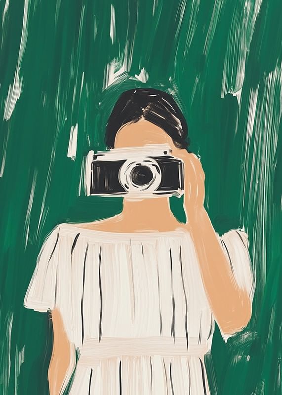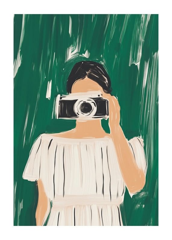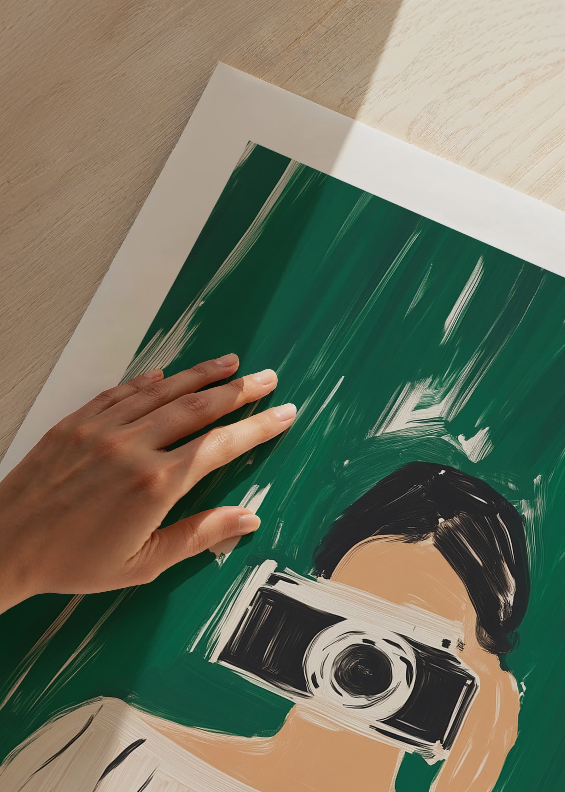Discover a world of creativity and mystery in this captivating poster. With a modern, sleek figure at the center, the motif captures the essence of the photographer's moment, wrapped in deep green hues that are both calming and inspiring.