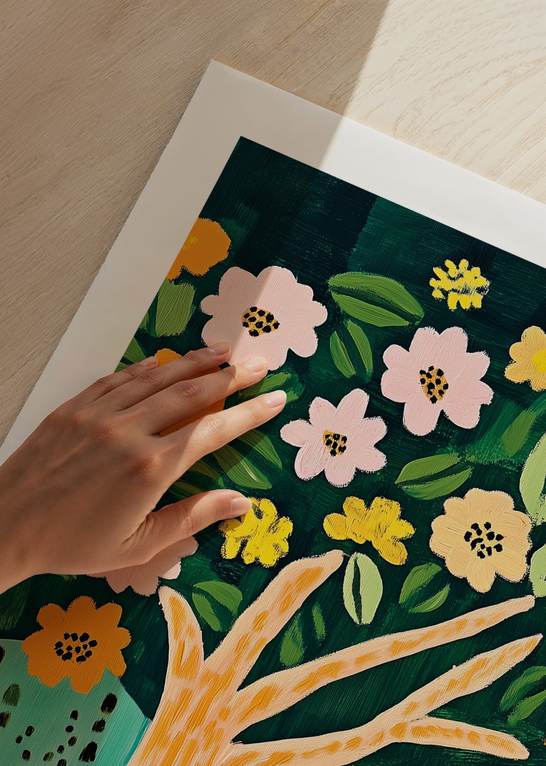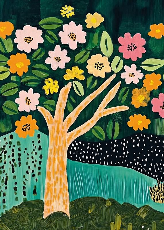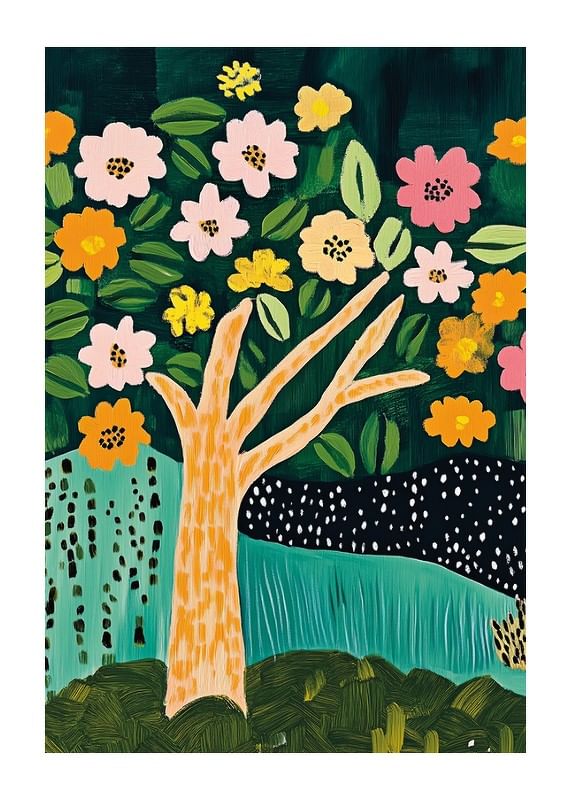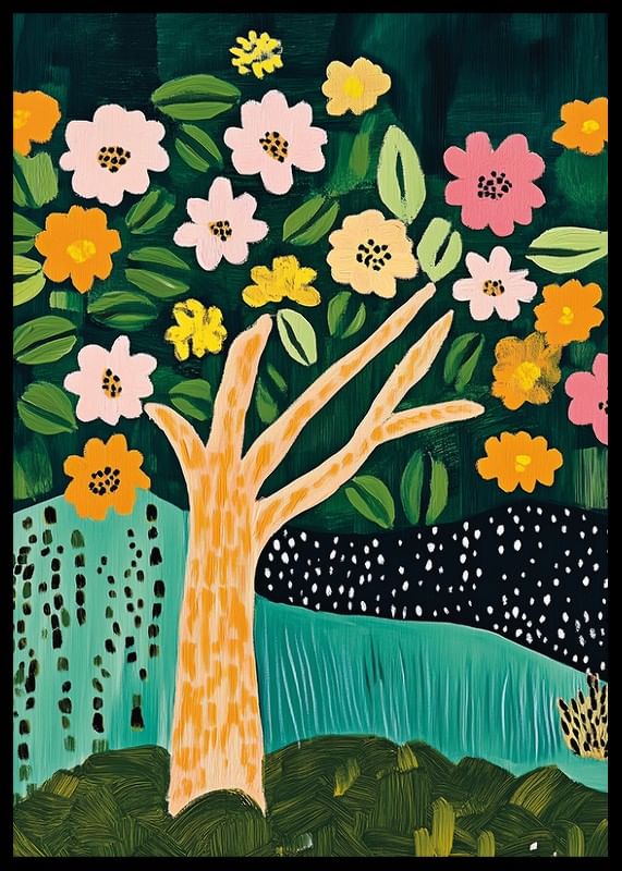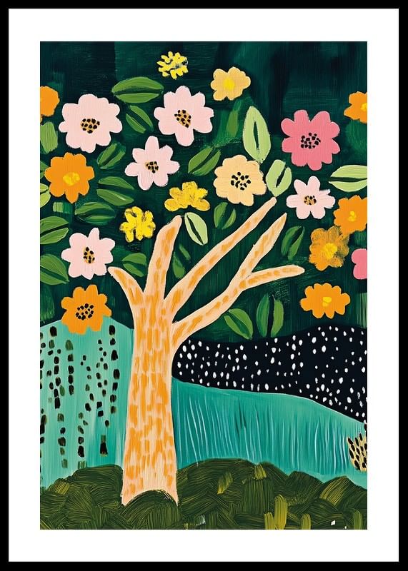 Bring the beauty of nature to life in your home with this lovely poster. A colorful tree adorned with patterned leaves and playful flowers in warm tones creates a sense of joy and harmony. The deep green landscape offers a peaceful contrast that deepens the image.