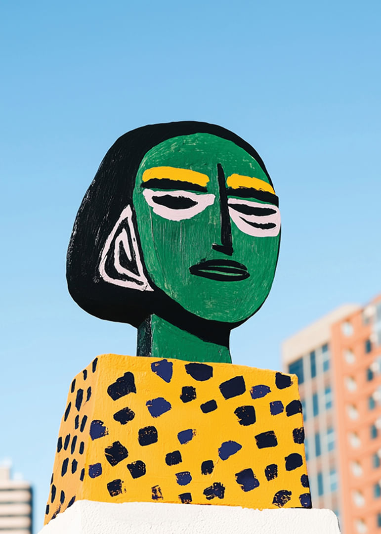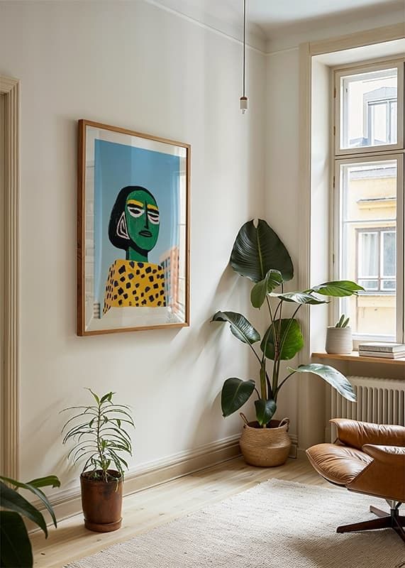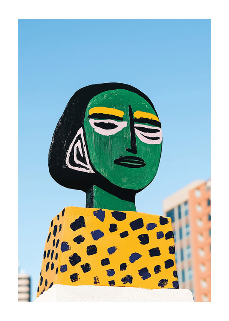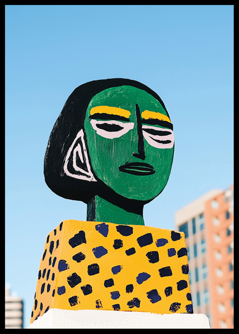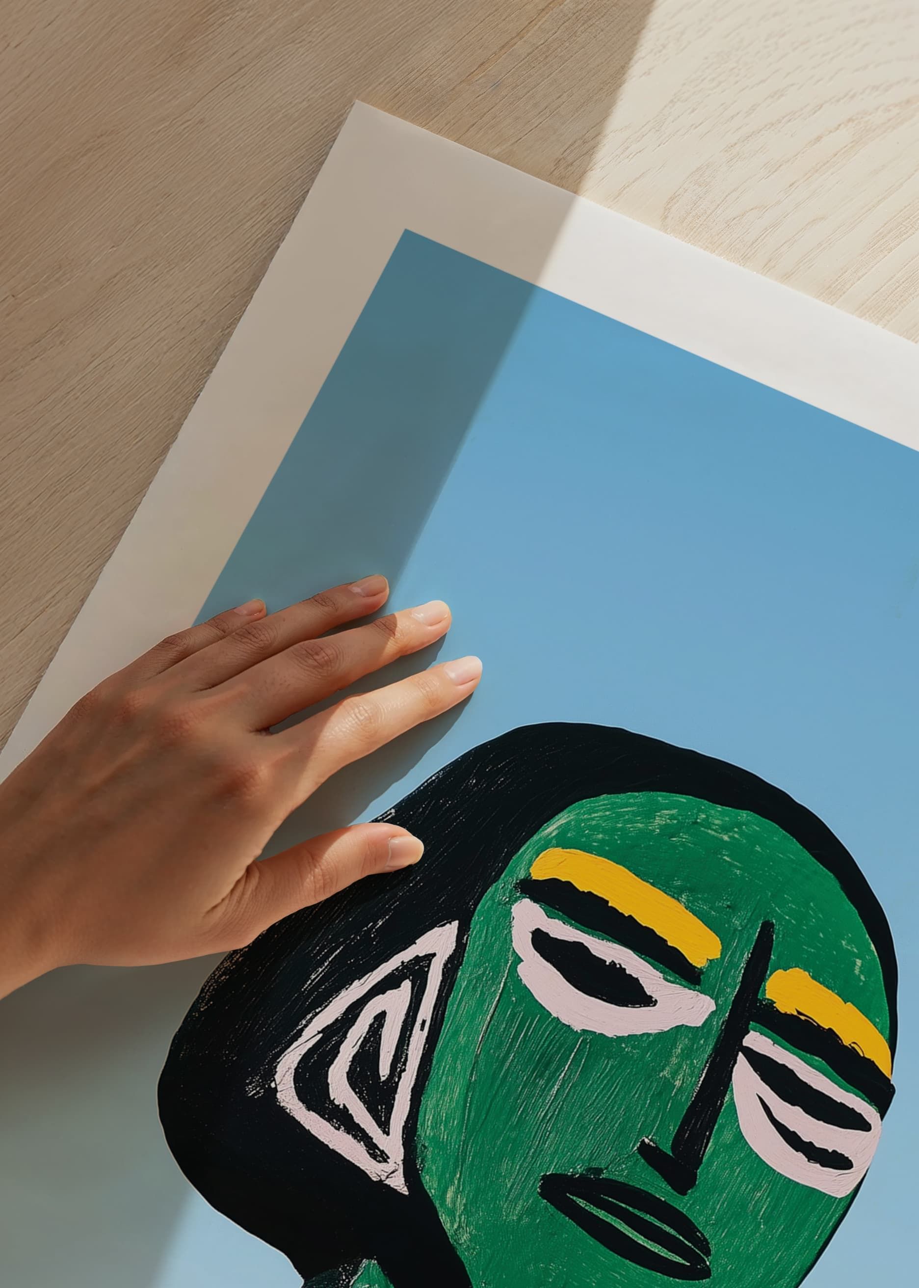 Brighten up your room with this expressive poster where a fascinating, stylized face meets the clear blue sky. The vibrant green and yellow hues of this artwork create a bold contrast that draws the eye.