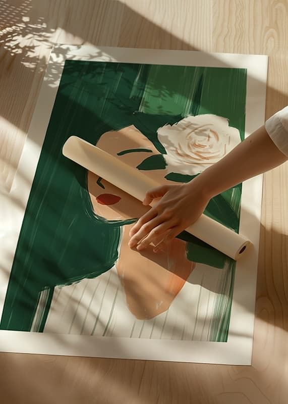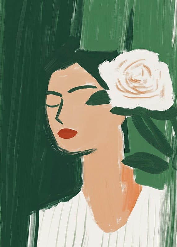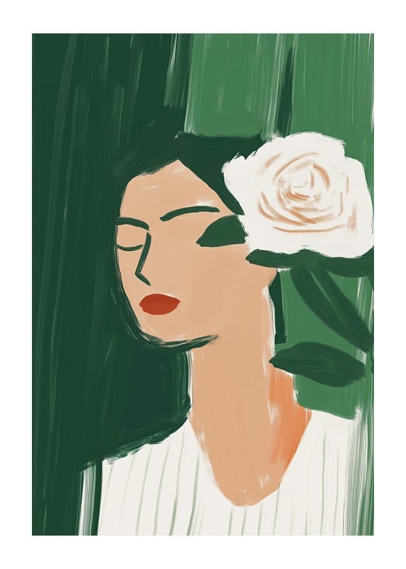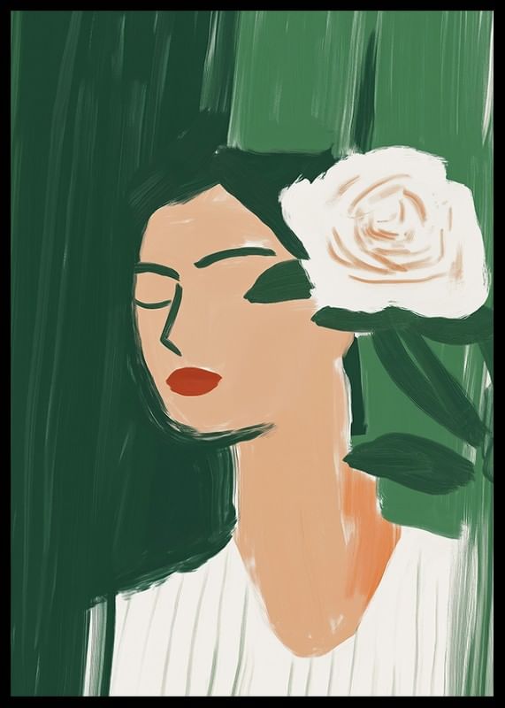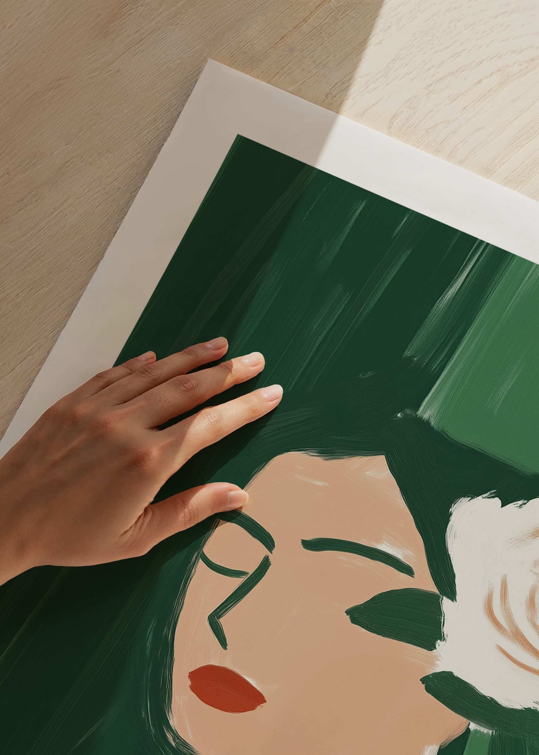 Experience a fusion of elegance and the beauty of nature with this art poster. The stylized face against a deep green background is enhanced by a flower in full bloom, symbolizing style and inner peace.