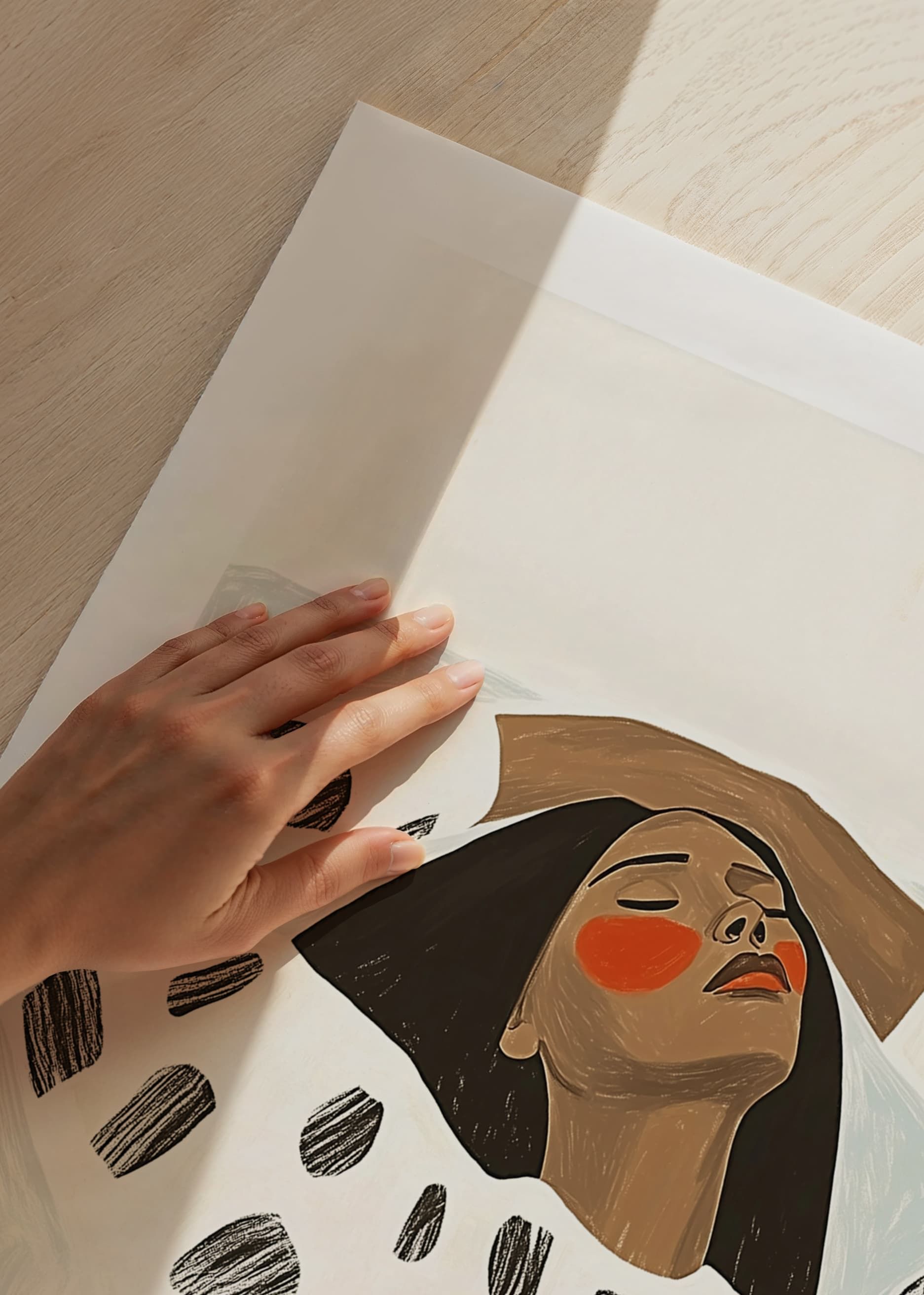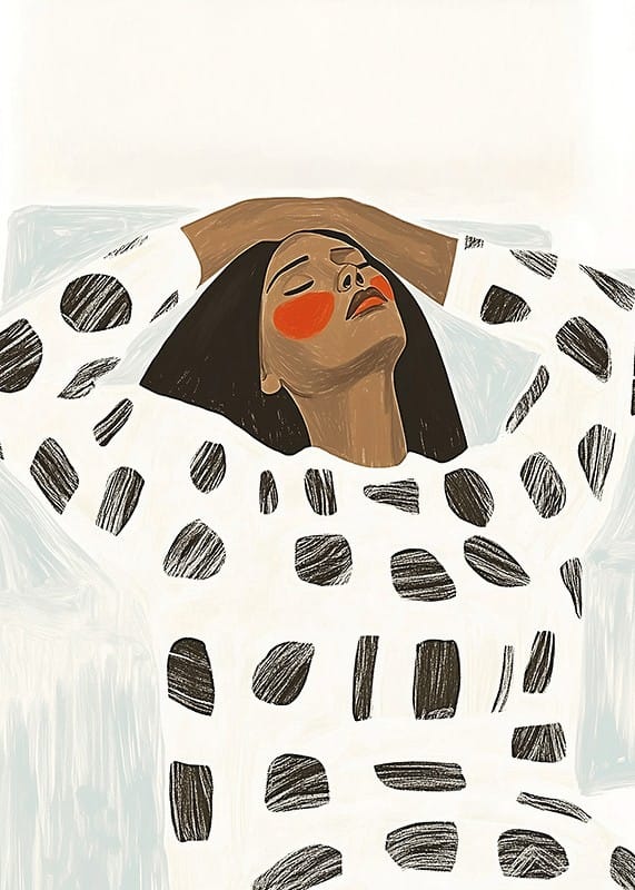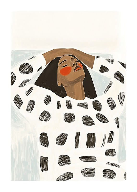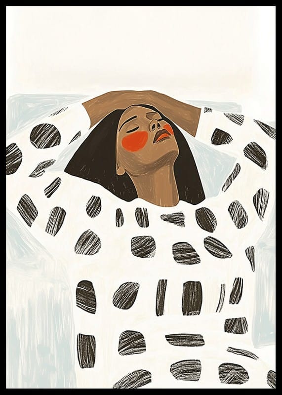Experience a dreamlike feeling with this fascinating poster, where elegance meets art. A woman rests with her eyes closed and her head tilted back, wearing a dress decorated with bold, black shapes that contrast against a soft background.
