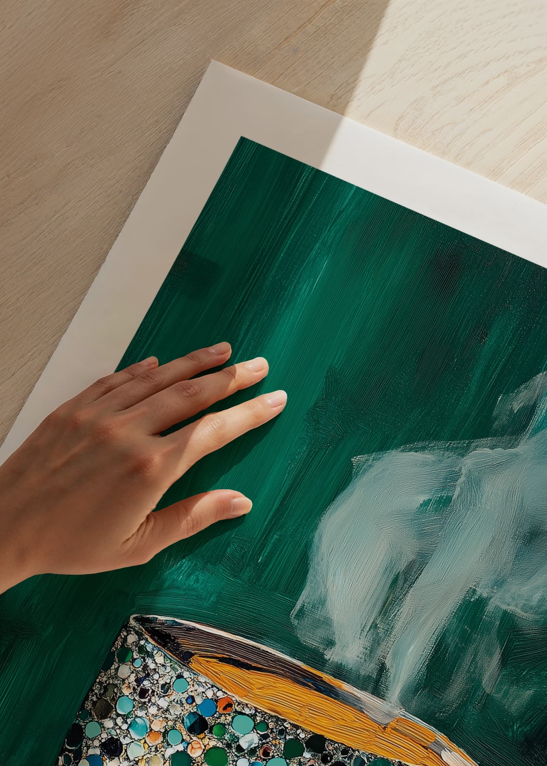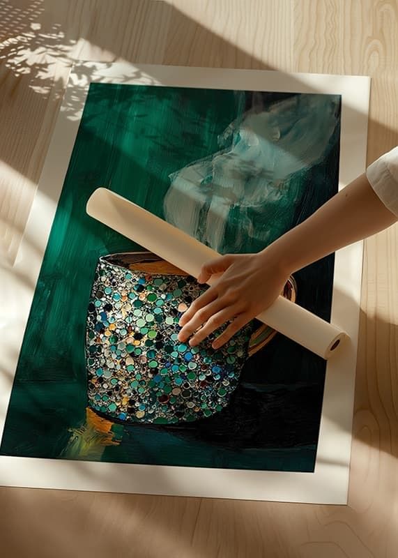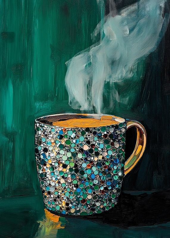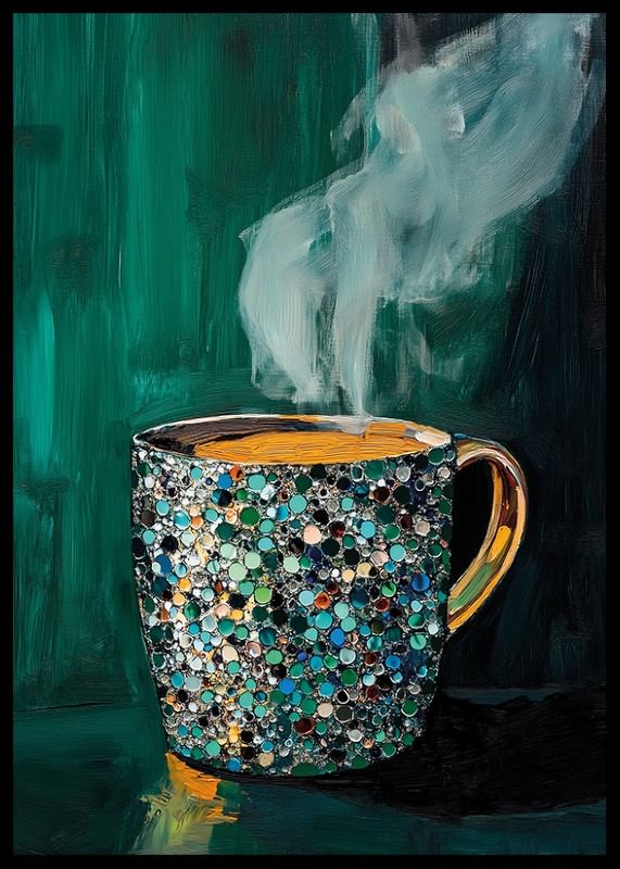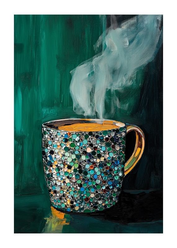 Discover the beauty of everyday moments with this captivating poster that captures a steaming cup in a sparkling mosaic style. The deep green background creates a sense of calm and mystery, while the colorful cup invites warmth and comfort.